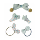 A set of 5 unique hair accessories in powder blue tone with a mix of 2 cute rubber bands and 3 hair clips. Embellished with stars, bows and pom poms, just the best bundle collection for your fantastic little stars and you.