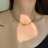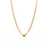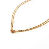 Golden Knot Necklace is a stunning piece of jewelry that is perfect for any occasion. The design features a minimal knot in the center of the chain. The simple and sophisticated design of this necklace makes it perfect for layering with other pieces or wearing on its own. The texture of the chain gives it a unique look and feel making it perfect to pair with work wear and party looks.