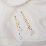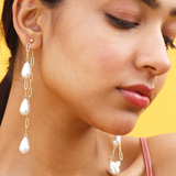 The reinvention of classic gold danglers married to glittering pearl drops makes it an iconic piece to have and adorn. Similar yet distinctive on both sides, these multilayered chain links add graceful feminity to all your perfectly set ensembles.