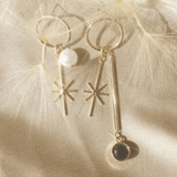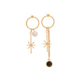 A mismatched pair of long danglers, designed with the celestial bodies, studded with quality stones and quality faux pearl which creates a classy combination.