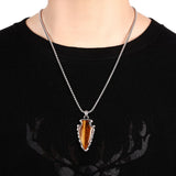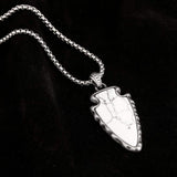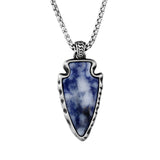 Triad Silver Necklace features a unique spearhead-shaped pendant with a natural stone inlay in four color and texture options - blue, brown, black, and white. It is a bold yet casual accessory that is versatile and can be worn by both men and women. The necklace adds character to any simple outfit, whatever the occasion may be.