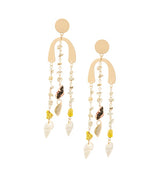 A boho-chic pair of metal-based funky danglers assorted with real shells and non-precious stones in golden and white color combination that gives it a strikingly beachy boho look.